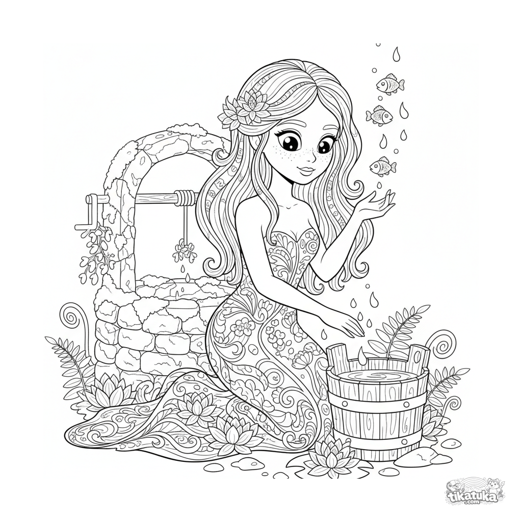 Детализированная раскраска для детей 10-12 лет: водяная дева с волосами-травами смотрится в отражение в ведре с живой водой у колодца. Мистическая сцена в стиле модерн с рыбами и папоротниками.