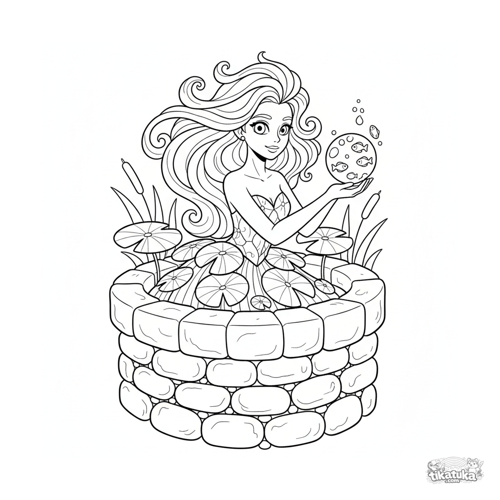 Раскраска для детей 7-9 лет: волшебная водяная наяда появляется из колодца с живой водой. Стиль ар-нуво, сцена в центре с широкими полями.