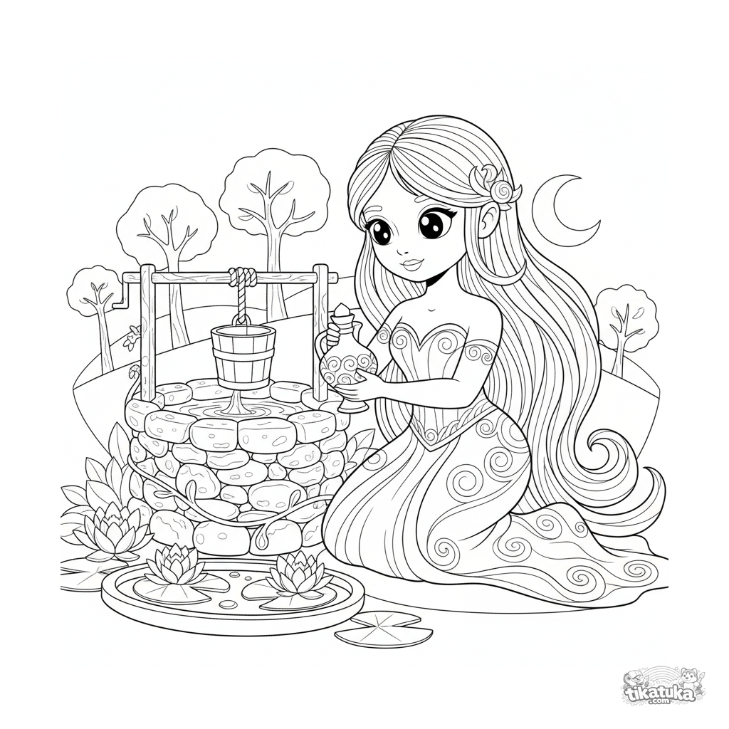 Раскраска для детей 4-6 лет: изящная водяная дева набирает волшебную воду из колодца в хрустальный флакон. Фольклорный образ с кувшинками и каплями росы.