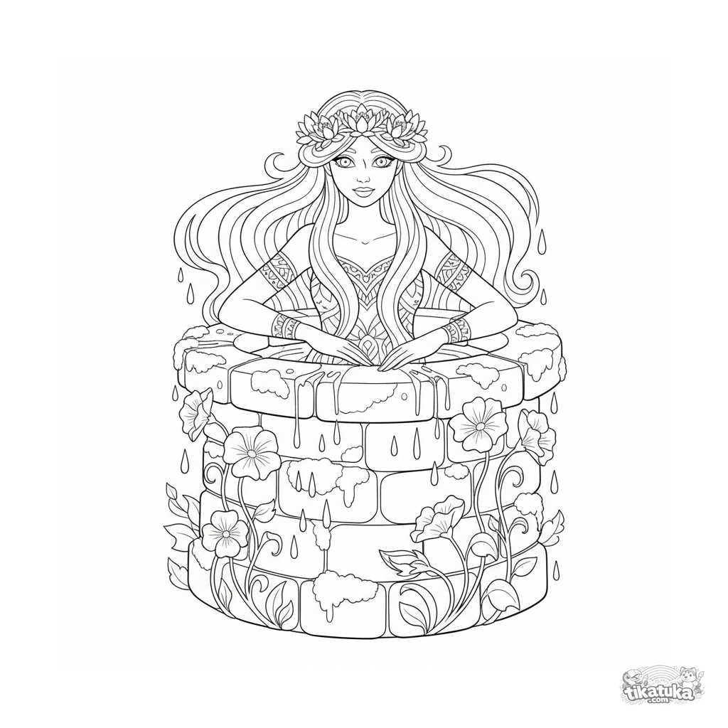 Сложная раскраска для детей 10-12 лет: русалка появляется из колодца с живой водой. Плавные линии в стиле модерн, детализированные волосы и растения.