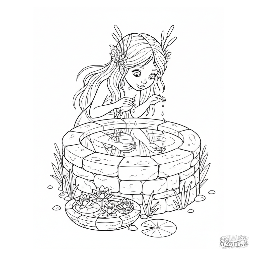 Раскраска для детей 7-9 лет: нежная водяная нимфа заглядывает в глубину колодца с живой водой. Реалистичная сцена с отражением, каплями и кувшинками.