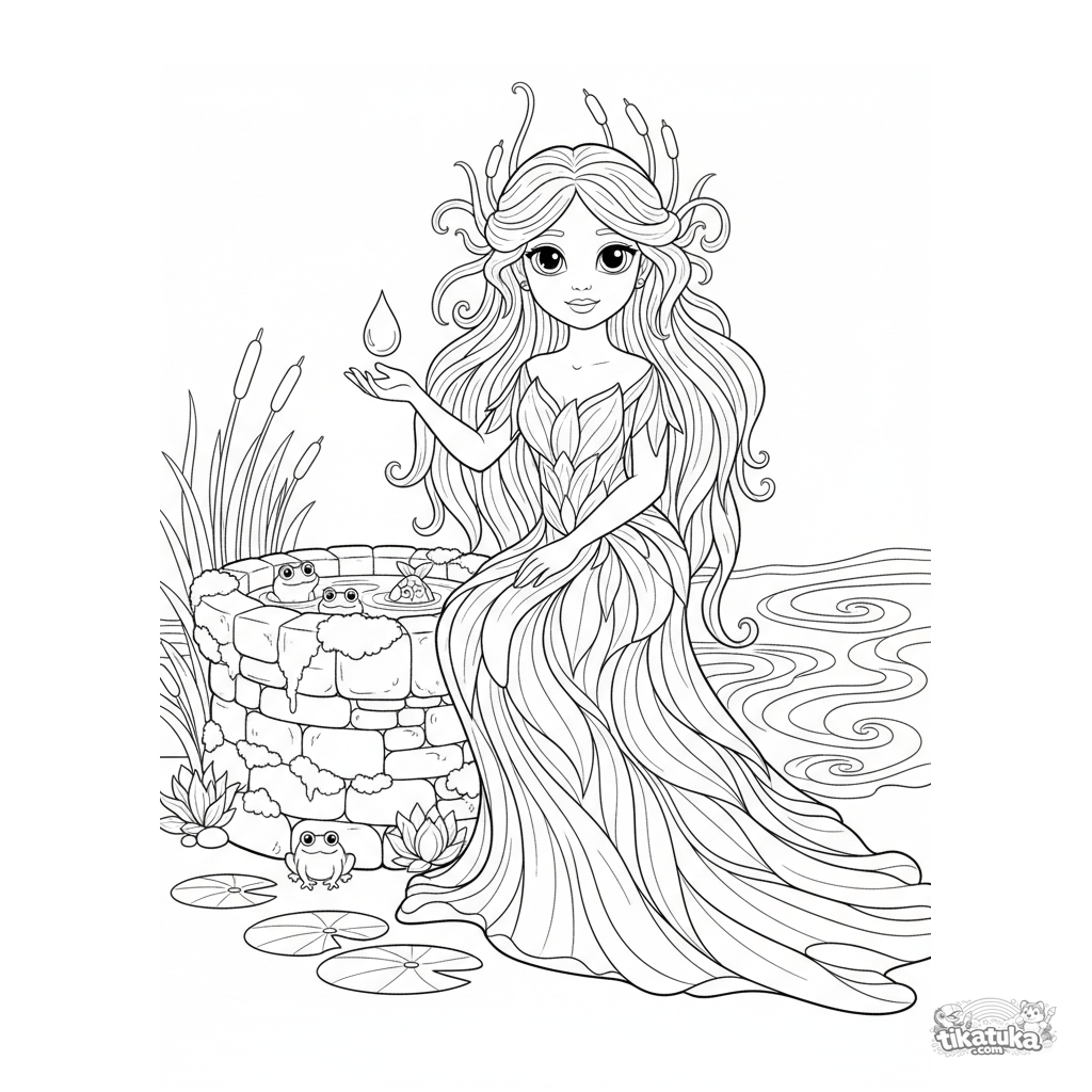 Раскраска для детей 7-9 лет: водяной дух-хранитель у колодца с живой водой. Плавные линии в стиле модерн, сказочная атмосфера.