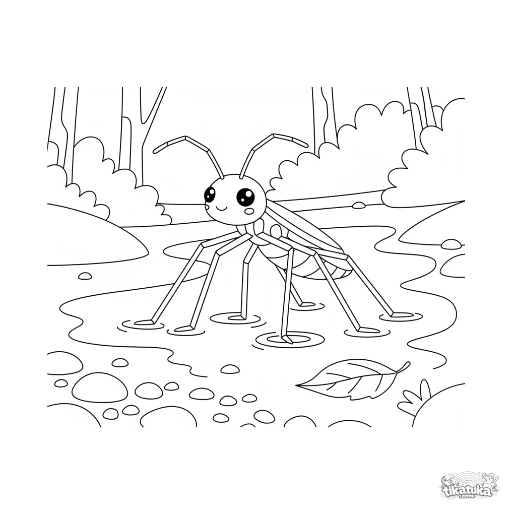 Раскраска для детей 4-6 лет: изящная водомерка стоит на длинных ножках на поверхности спокойного ручья. Геометрический минималистичный стиль, интересные формы.