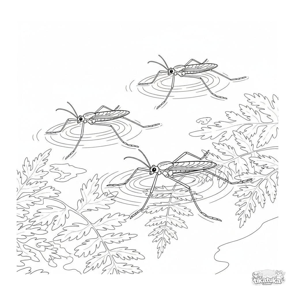 Раскраска для детей 10-12 лет: детализированные водомерки скользят по поверхности прозрачного ручья. Стилизованная под старинную гравюру сцена с насекомыми.