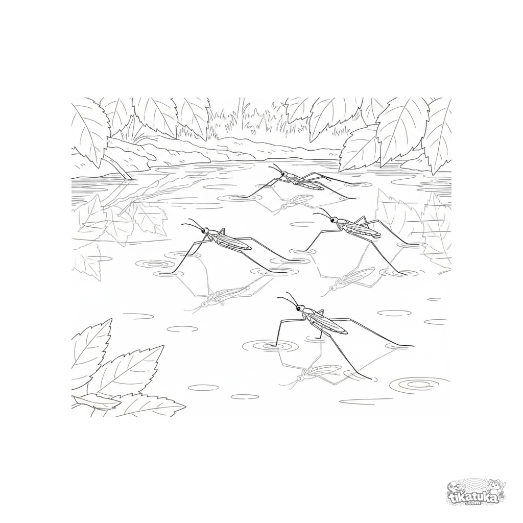 Сложная раскраска для 10-12 лет: водомерки скользят по зеркальной поверхности лесного ручья, оставляя круги. Стиль старинной гравюры с детальной прорисовкой насекомых и ряби на воде.