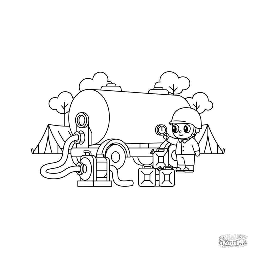 Раскраска для детей 4-6 лет: большой водовоз-цистерна заправляется водой из насоса возле палаток полевого штаба.