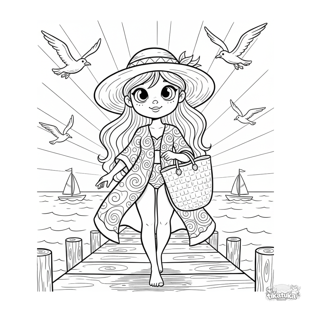 Раскраска в стиле акварельного скетча для девочек 10-12 лет: девушка в пляжном комплекте идет по деревянному пирсу на закате, вокруг чайки и парусники.