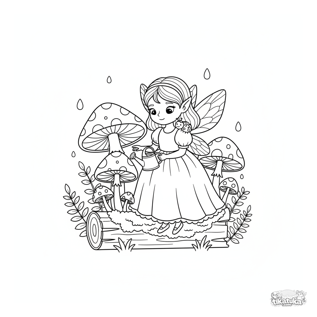 Раскраска для детей: фея-принцесса ухаживает за светящимися грибами в волшебном лесу. Средняя сложность, подходит для девочек 5-7 лет.