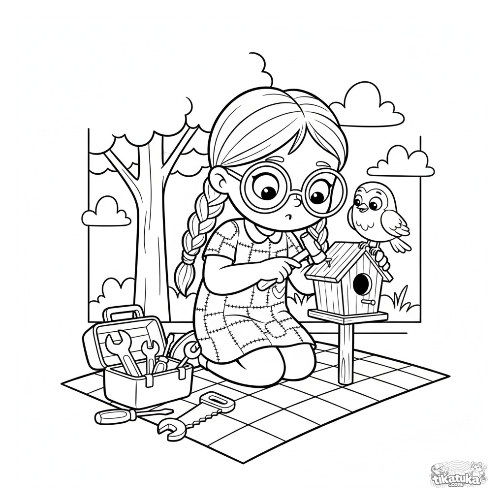 Раскраска для детей 5-8 лет: девочка в пёстром платье с косичками строит скворечник на клетчатом пледе, а на её плече сидит любопытный малиновка.