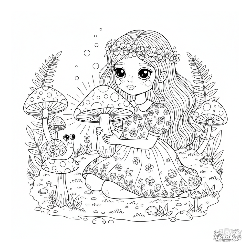 Раскраска для детей 6-9 лет: волшебная девочка в цветочной короне осторожно держит светящийся гриб-фонарик на лесной полянке, окружённая светящимися спорами.