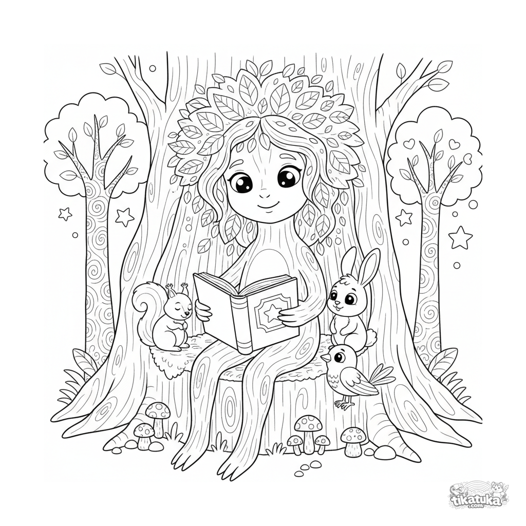 Раскраска для детей 4-6 лет: добрый древний энт читает большую книгу белке, кролику и птичке в своем уютном дупле.