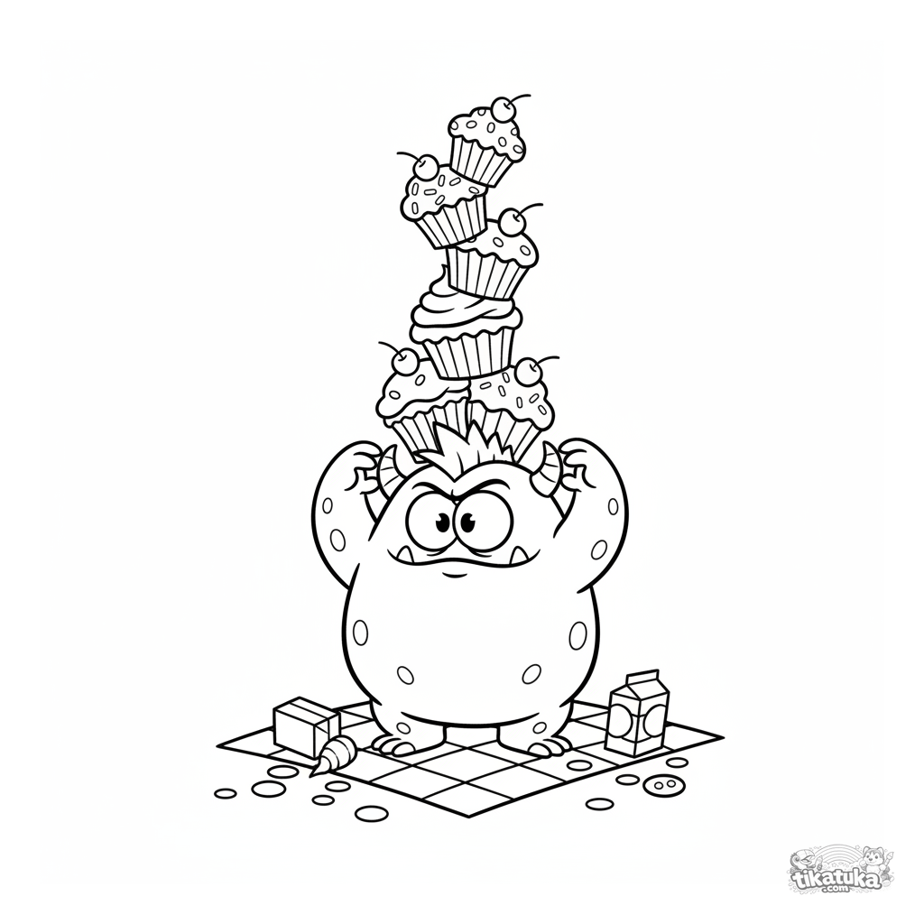 Раскраска для детей 7-9 лет: широкий монстр в стиле Ханна-Барбера балансирует башней из кексов на пикнике. Смешная и динамичная сцена.