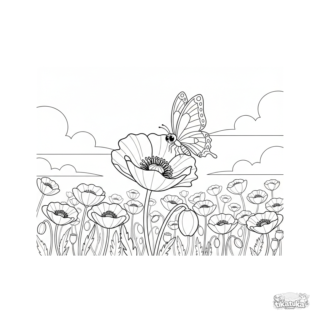 Раскраска для детей 4-6 лет: маковое поле на закате с бабочкой. Красивая и простая сцена в стиле модерн для раскрашивания.