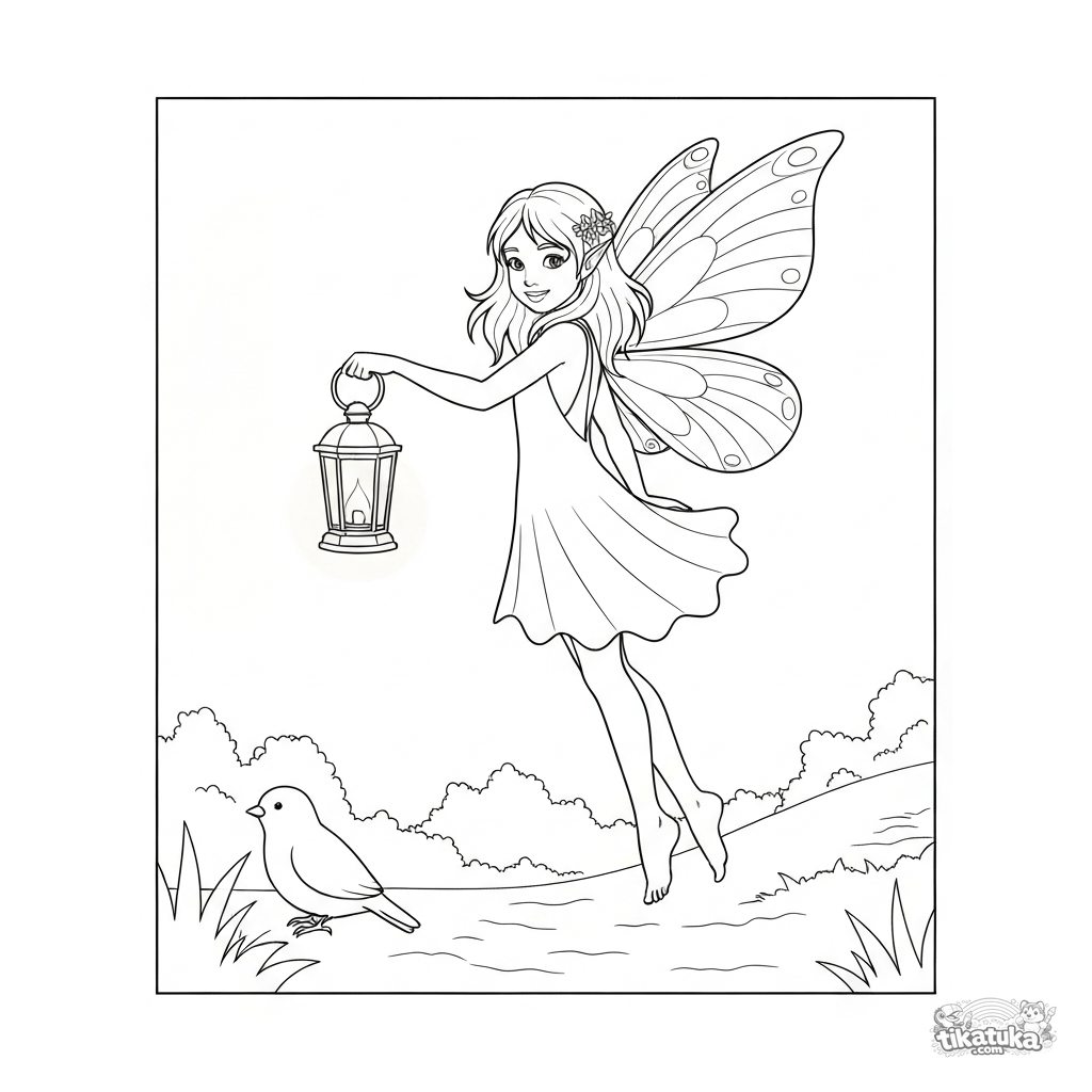 Раскраска для девочек: нежная фея-огонёк светит фонариком, показывая путь. Простой реалистичный рисунок с волшебным сюжетом для детей 3-5 лет.