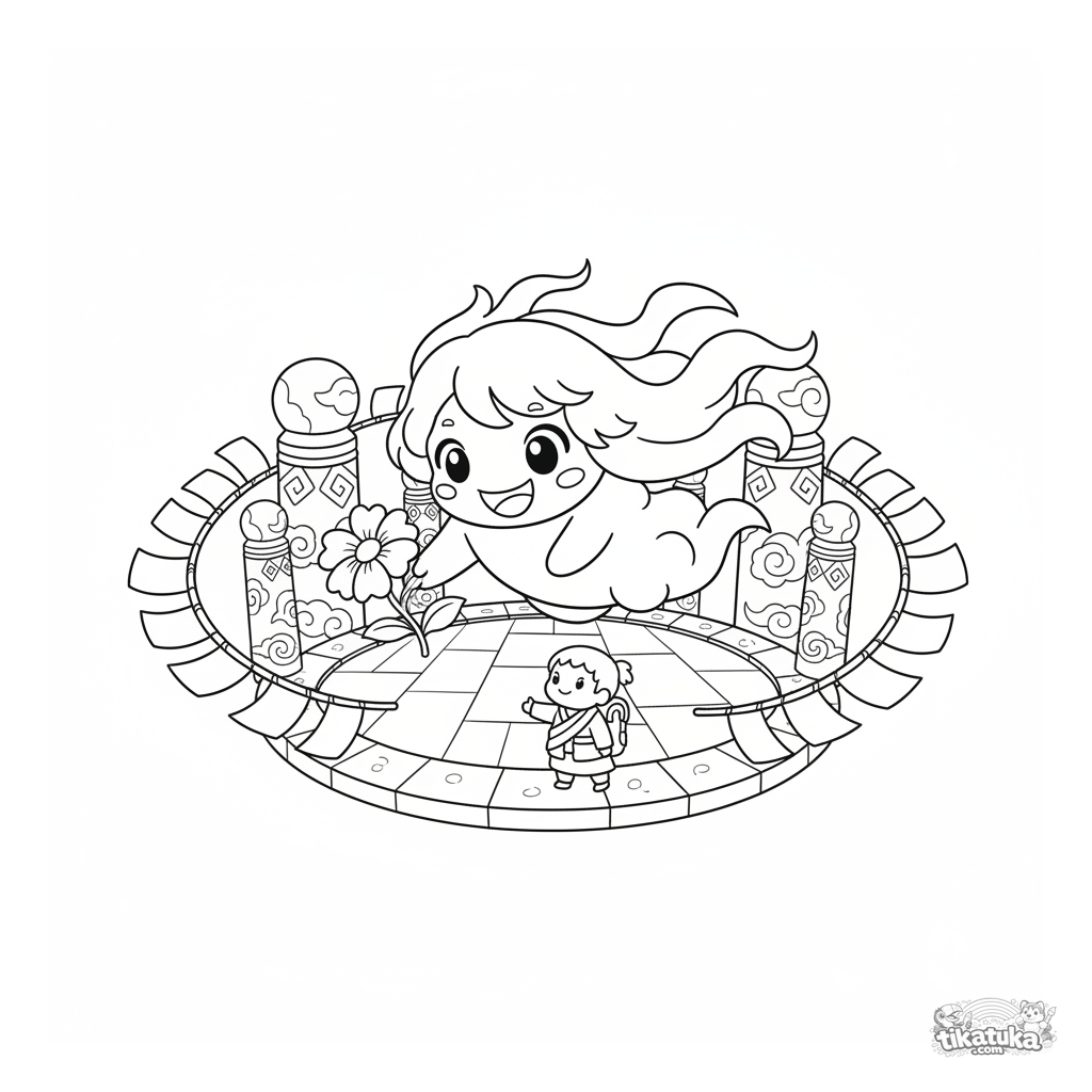 Раскраска для детей 5-9 лет: весёлый дух ветра помогает путнику в древнем горном храме. Динамичные линии и позитивный сюжет для раскрашивания.
