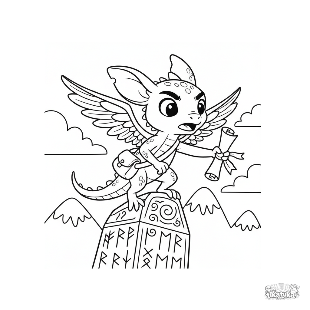 Раскраска для детей 7-9 лет: крылатый ящер-посыльный с важным видом доставляет свиток к руническому монолиту. Динамичная поза, сумка через плечо, четкие контуры.