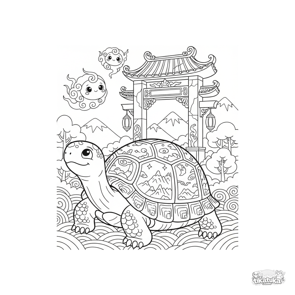 Раскраска для детей 5-9 лет: мудрая древняя черепаха встречает светящихся духов-богов у ворот горного храма. Сцена в стиле народного лубка.