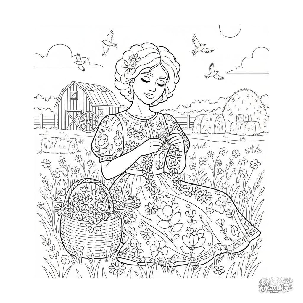 Раскраска для детей: девушка в ярком народном платье плетёт цветочный венок на летнем лугу. Спокойная и красивая сцена фольклорного быта.