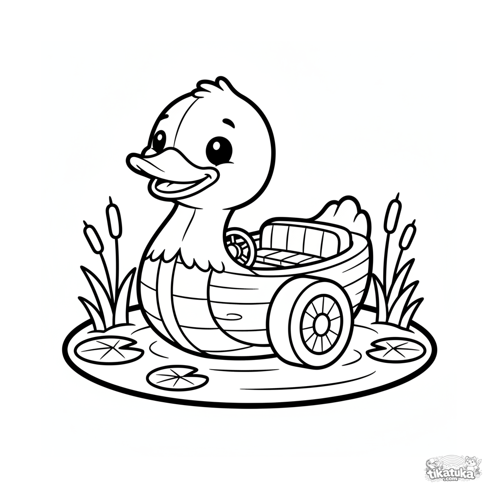Раскраска для малышей: уточка-лодочка на спокойном пруду. Простые формы, широкие поля для легкого раскрашивания детьми 2-3 лет.
