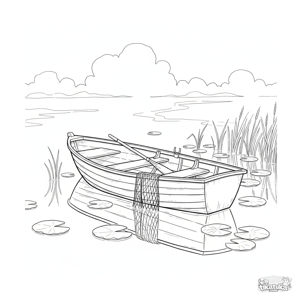 Раскраска для детей 7-9 лет: деревянная рыбацкая лодка на спокойном туманном озере на рассвете. Простые формы, детали среднего уровня.