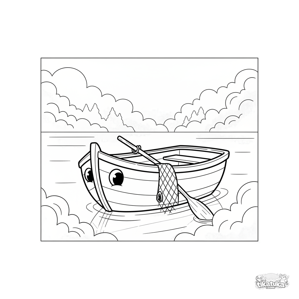Раскраска для детей 4-6 лет: деревянная рыбацкая лодка дрейфует в тихом утреннем тумане на спокойном озере. Простые формы, понятный сюжет.