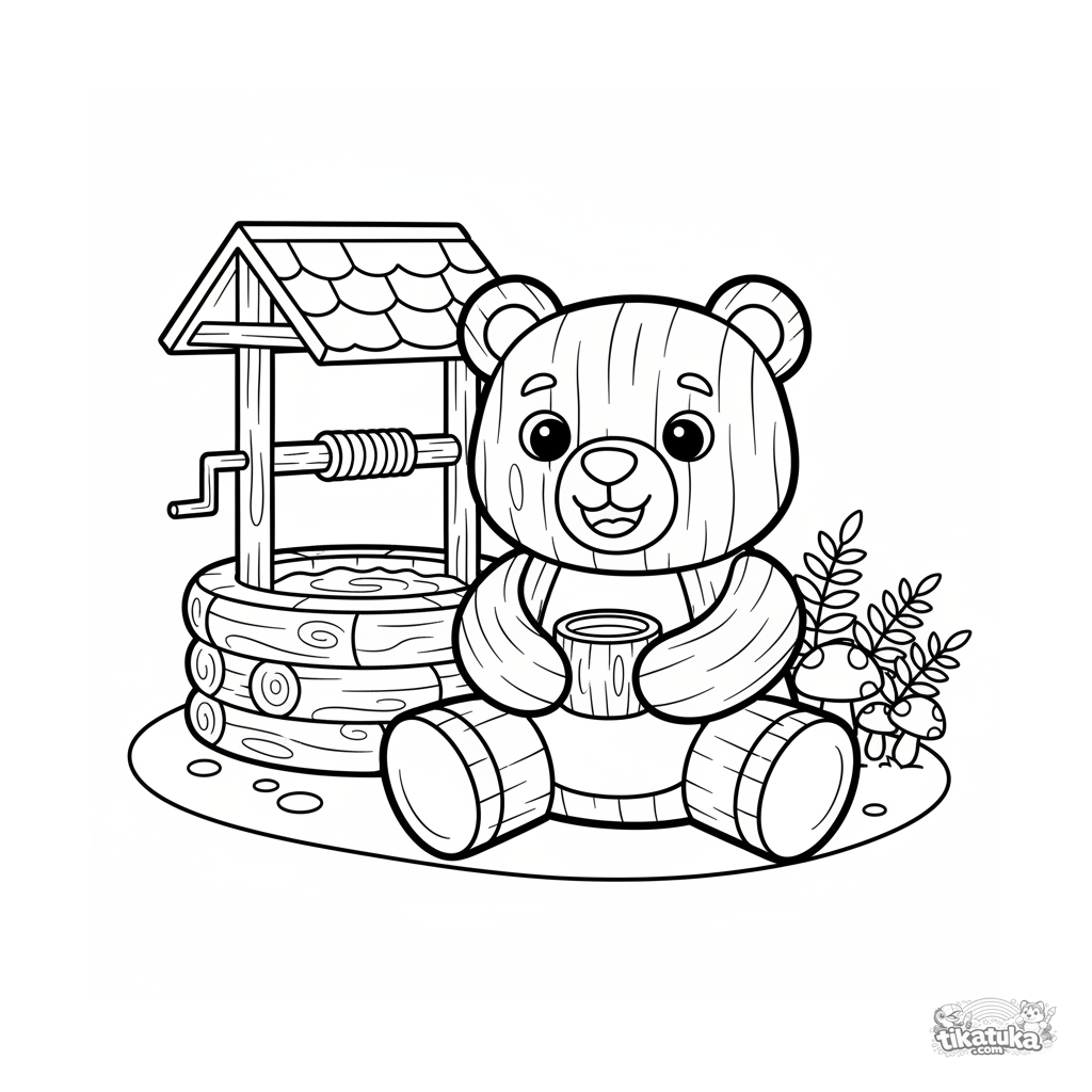 Простая раскраска для малышей 2-3 лет: добрый деревянный мишка сидит у колодца. Крупные четкие формы, мало деталей, идеально для первых карандашей.