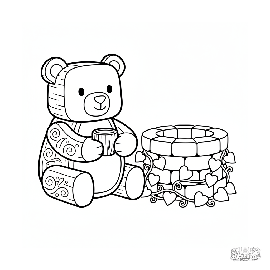 Простая раскраска для малышей 2-3 лет: добрый деревянный мишка-страж сидит у каменного колодца с живой водой. Крупные четкие формы, мало деталей.
