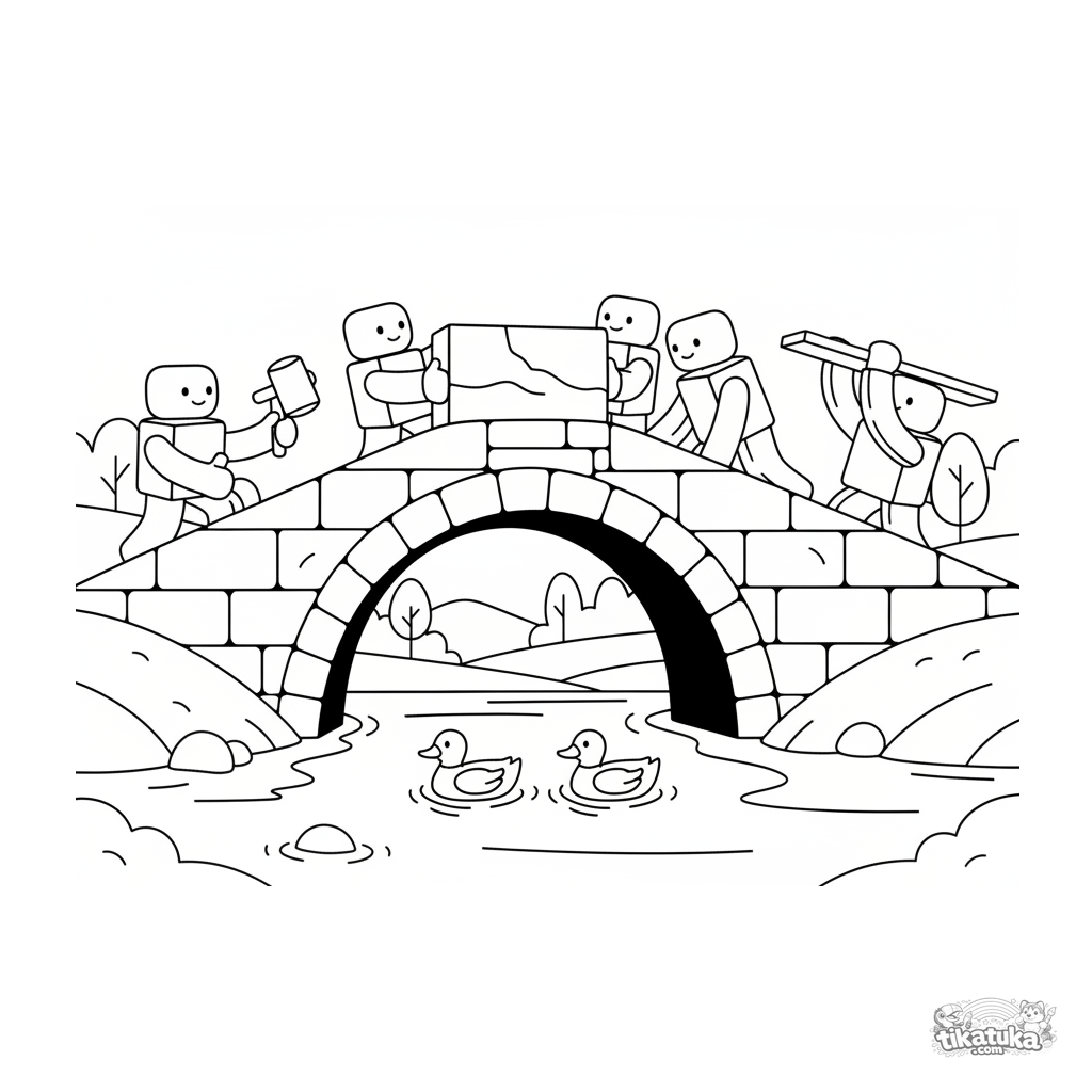 Раскраска для детей 4-6 лет: игрушечные строители завершают каменный мост через реку. Простые геометрические фигуры и веселая сцена.