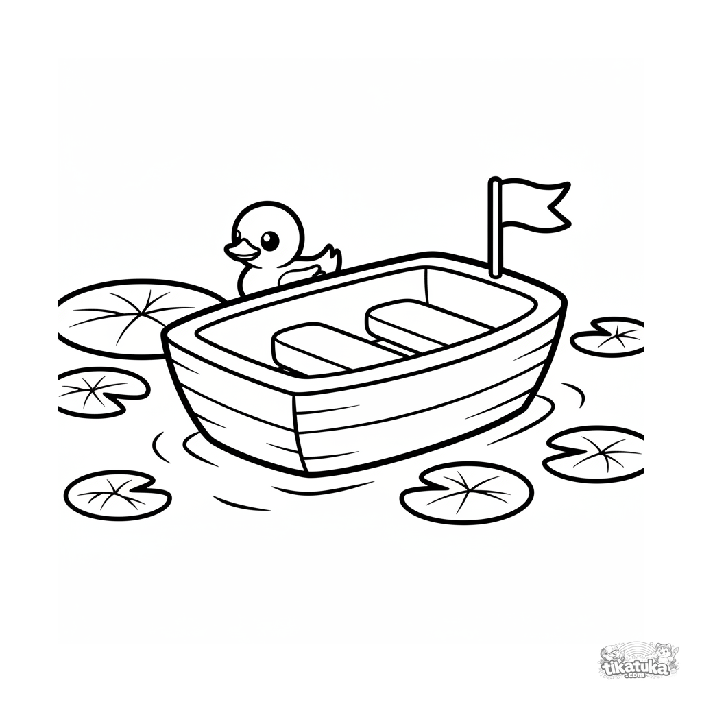 Раскраска для малышей: деревянная игрушечная лодочка плывет по тихому лесному пруду. Простые формы и широкие поля идеальны для первых карандашей.
