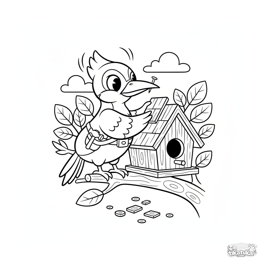 Раскраска для детей 7-9 лет: дятел в роли плотника чинит крышу деревянного скворечника. Забавная сцена с инструментами и гвоздем в клюве, динамичная поза.