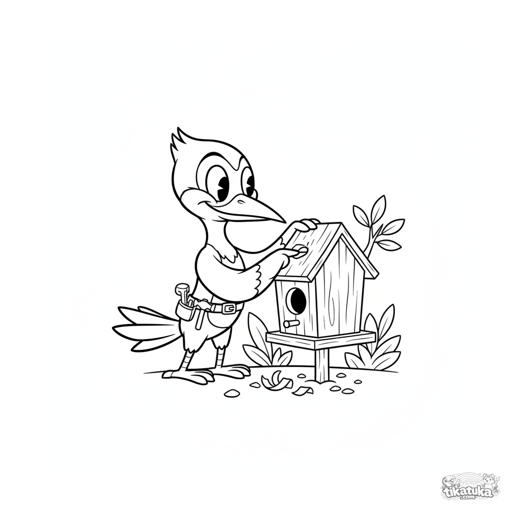 Раскраска для детей 7-9 лет: дятел в ретро-стиле проверяет качество постройки деревянного скворечника. У него есть пояс с инструментами. Динамичная и забавная сцена.