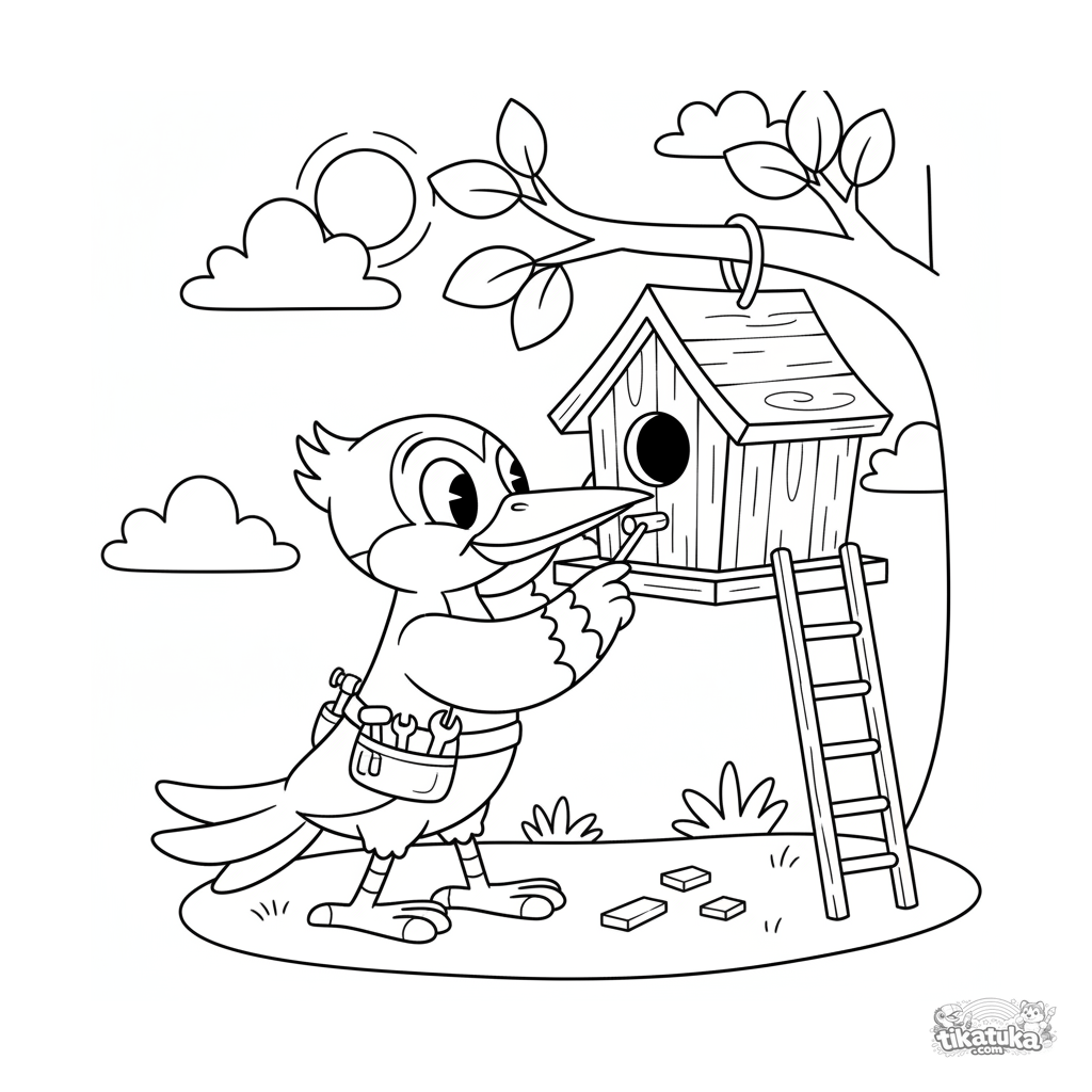 Раскраска для детей 4-6 лет: весёлый дятел в ретро-стиле проверяет деревянный скворечник. На поясе инструменты, рядом лестница. Забавная сцена для раскрашивания.
