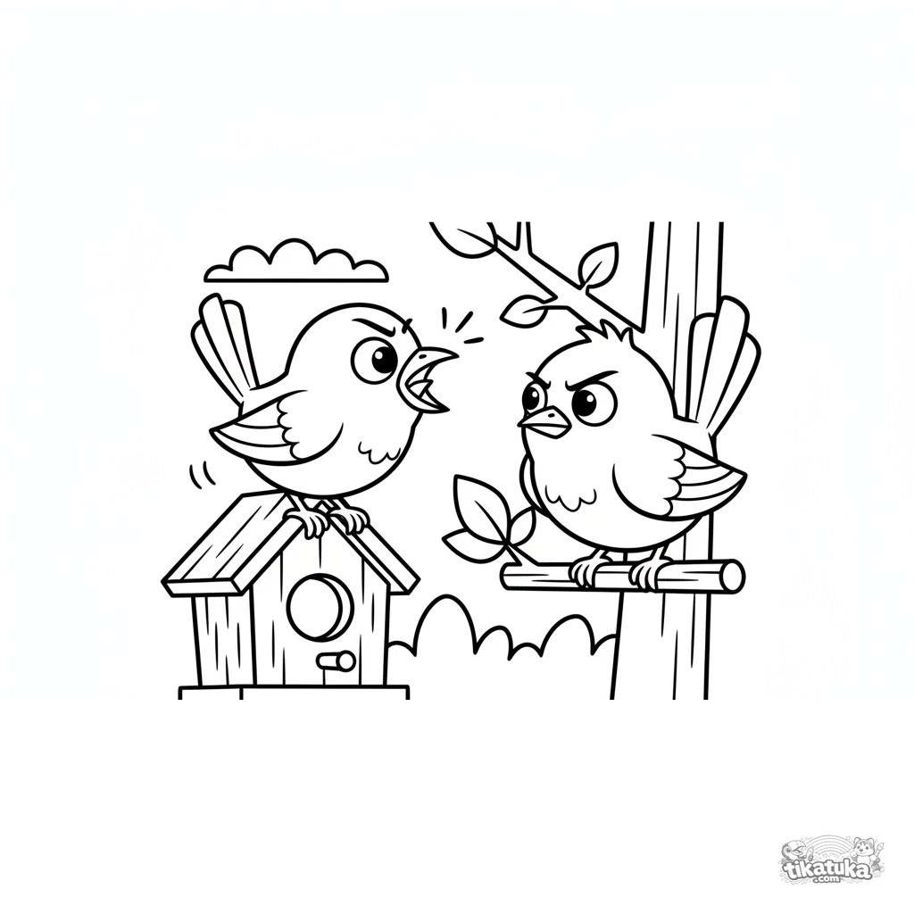 Раскраска для детей 7-9 лет: два забавных крапивника устроили оживленный спор на жердочке перед входом в скворечник. Выразительные позы и эмоции.