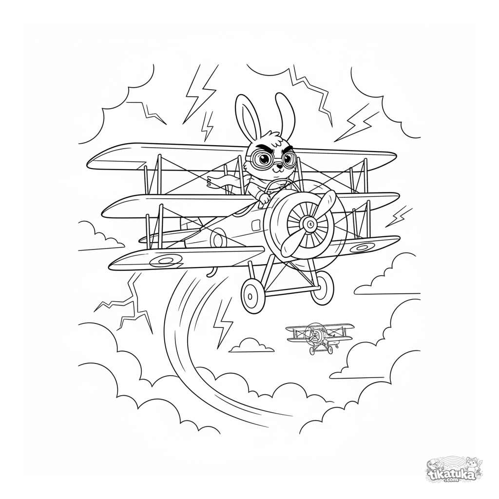 Раскраска для детей 7-9 лет: триплан времен Первой мировой войны выполняет петлю в грозовом небе. Динамичная сцена в стиле мультфильмов 80-х.
