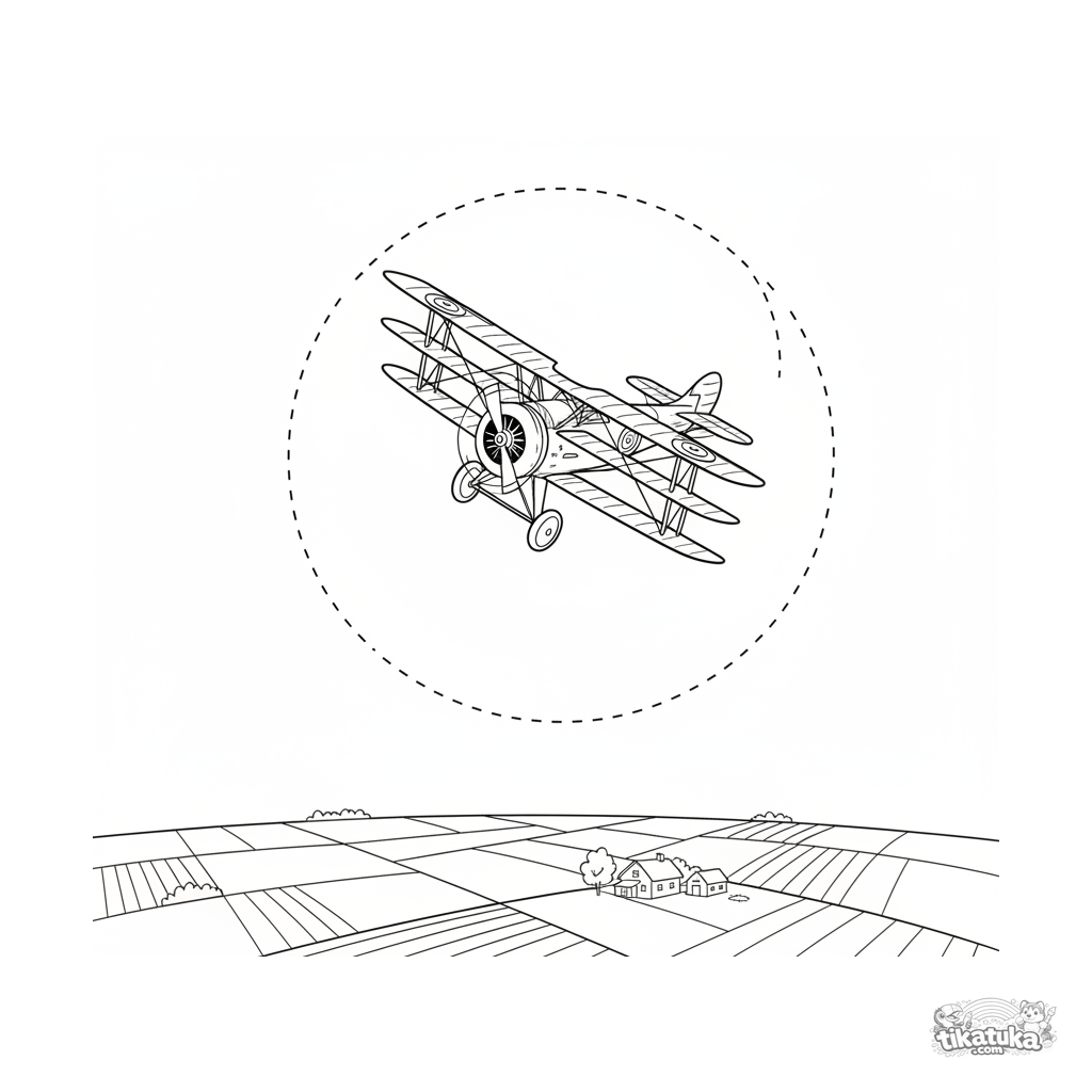 Раскраска исторического триплана, выполняющего петлю над сельской местностью. Для детей 7-9 лет. Четкие технические детали, динамичная поза.