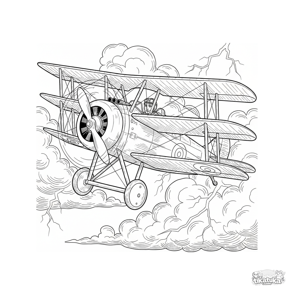 Детальная раскраска триплана времен Первой мировой, выполняющего петлю в грозовом небе. Для детей 10-12 лет. Стиль старинной гравюры, много деталей.