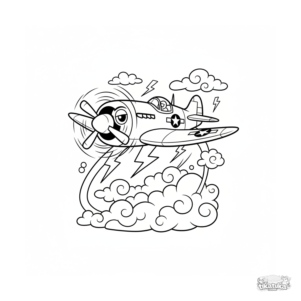 Раскраска для детей 7-9 лет: мультяшный истребитель времен Второй мировой выполняет мертвую петлю в грозовом небе с молниями. Энергичные линии.