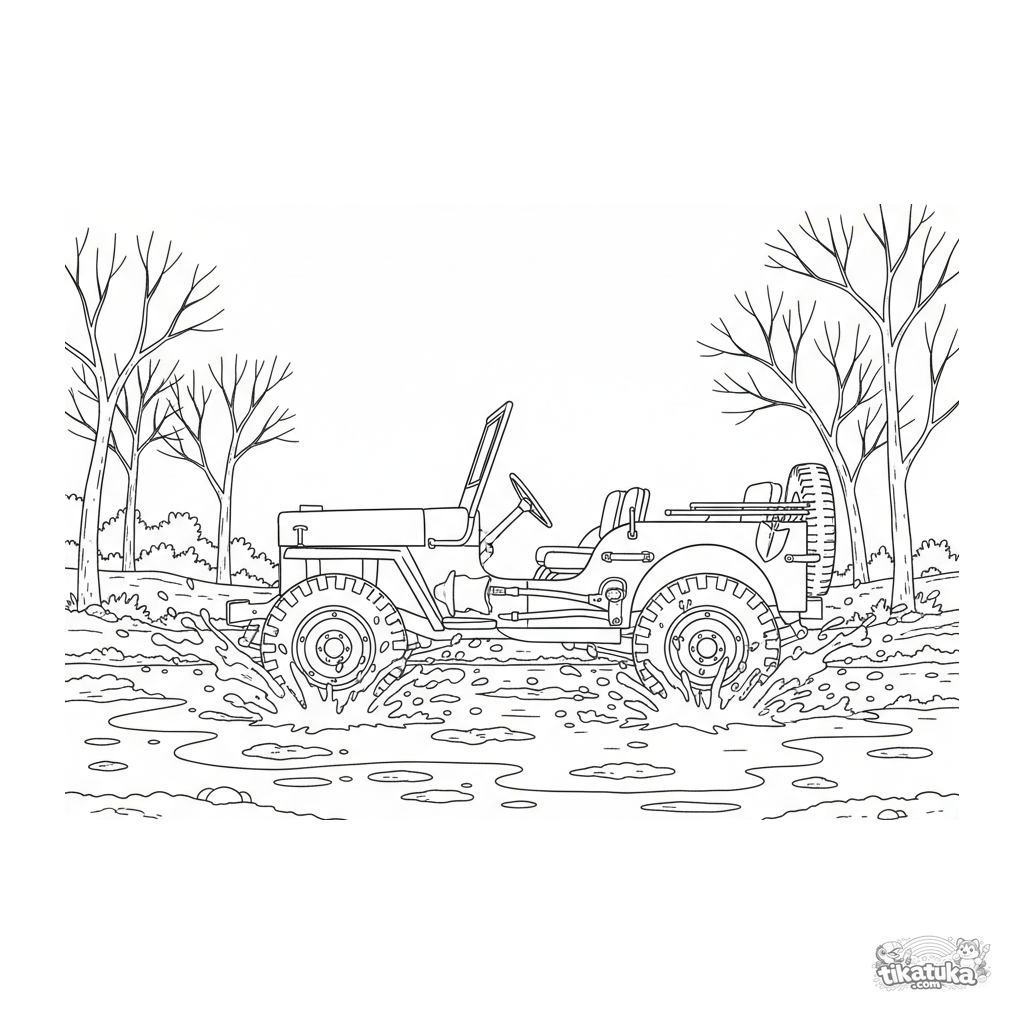 Сложная раскраска для мальчиков 7-12 лет: армейский джип времён Второй мировой едет по грязной дороге. Высокая детализация машины, брызги грязи, реалистичный стиль.