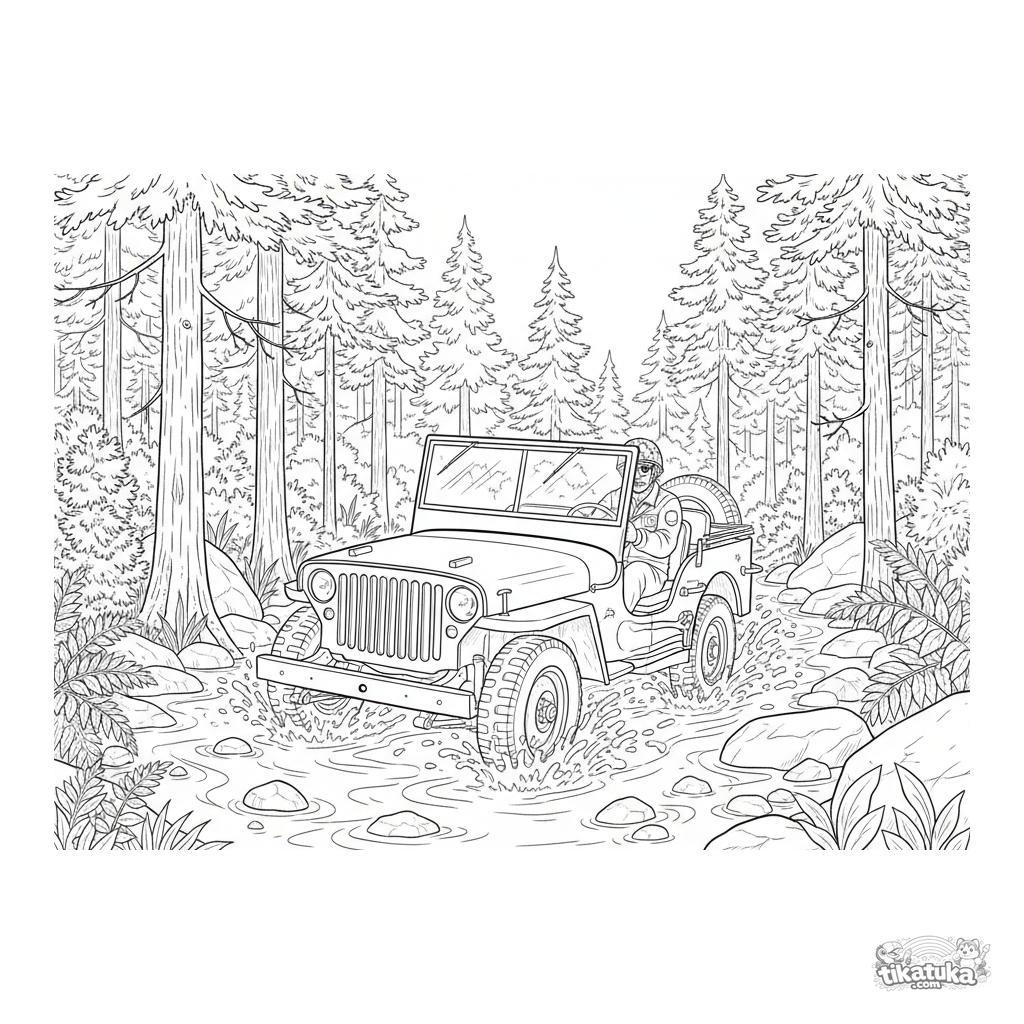 Раскраска для мальчиков 7-12 лет: детализированный армейский джип времен Второй мировой едет через неглубокий каменистый ручей в лесу.