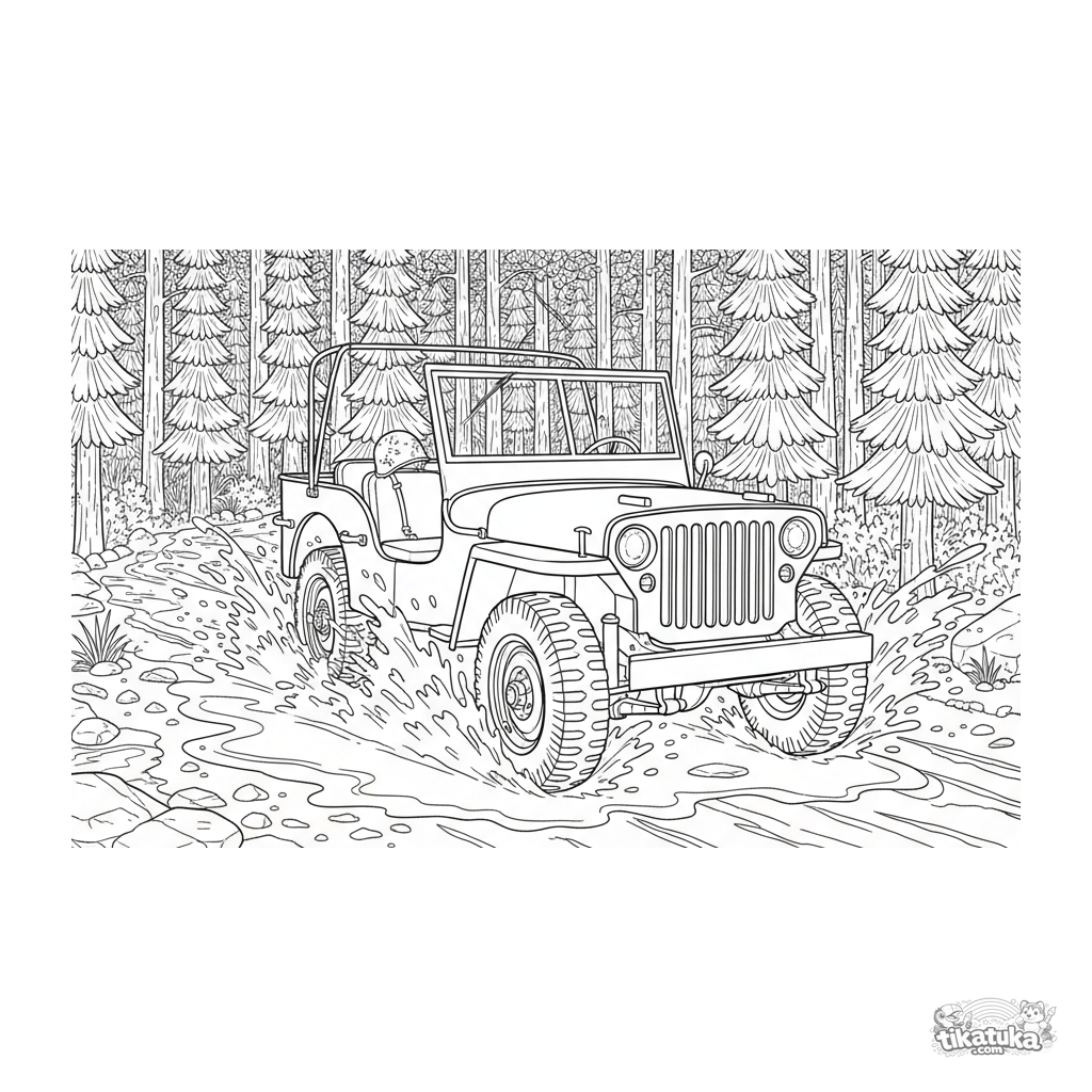 Сложная раскраска для мальчиков 7-12 лет: детализированный армейский джип времен Второй мировой, мчащийся по грязной лесной дороге.