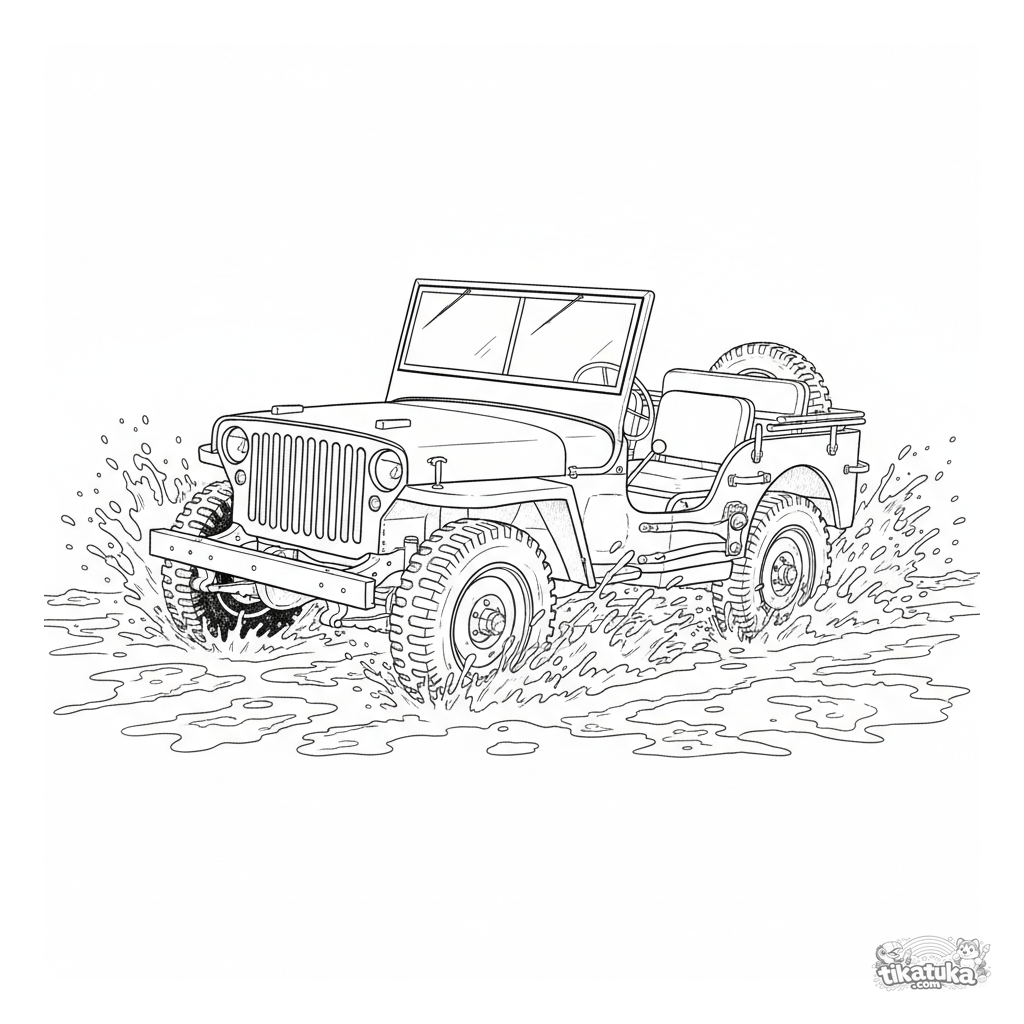 Раскраска для мальчиков 7-12 лет: детализированный армейский джип времен Второй мировой войны едет по грязному полю. Высокая сложность, реалистичные детали.