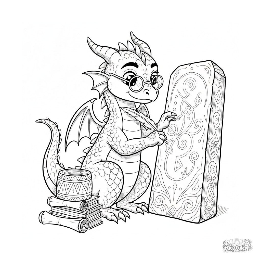 Сложная раскраска для детей 10-12 лет: ученая виверна в очках внимательно изучает и обводит древние руны на монолите. Много деталей, аксессуары, стиль старинной гравюры.