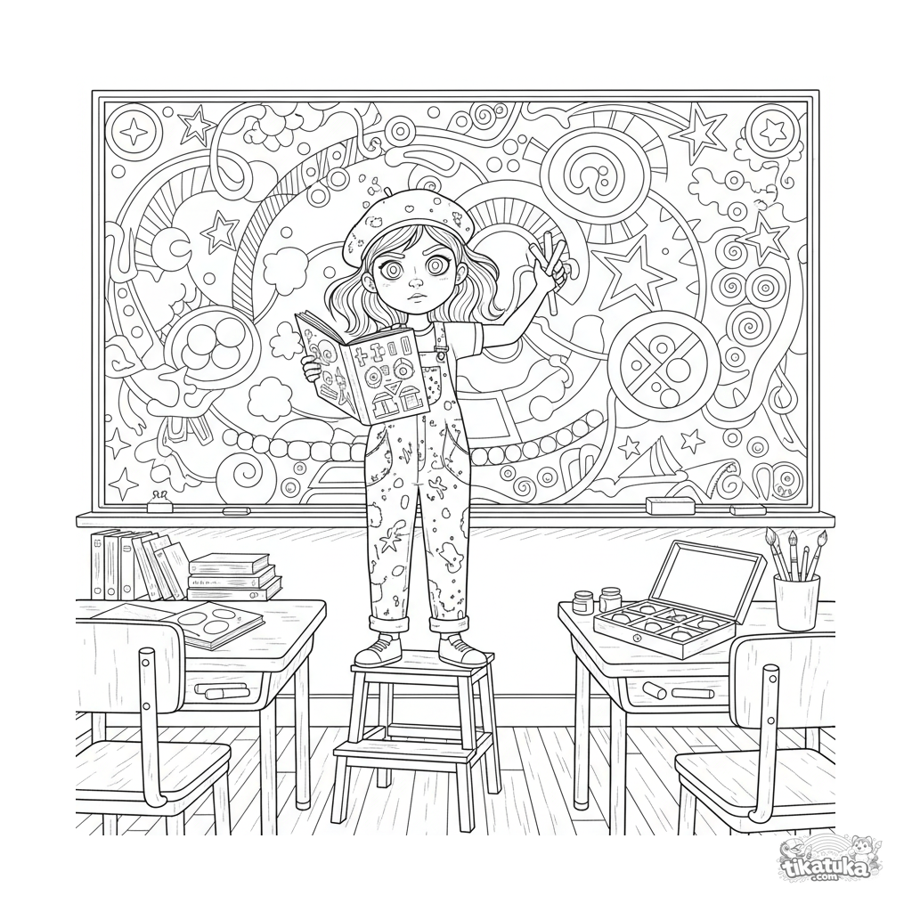 Раскраска для детей 10-12 лет: юная художница в рабочей одежде создаёт меловой мурал на школьной доске, окружённая красками и кистями.