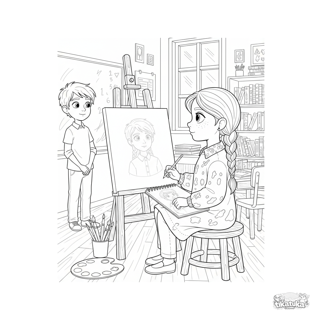 Раскраска для детей 10-12 лет: юная художница рисует портрет одноклассника у мольберта в классе. Детализированная сцена с художественными принадлежностями.