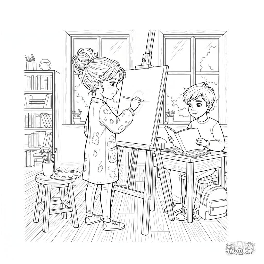 Раскраска для детей 10-12 лет: юная художница в классе рисует портрет одноклассника за мольбертом. Детализированная сцена, художественные принадлежности, реалистичные пропорции.