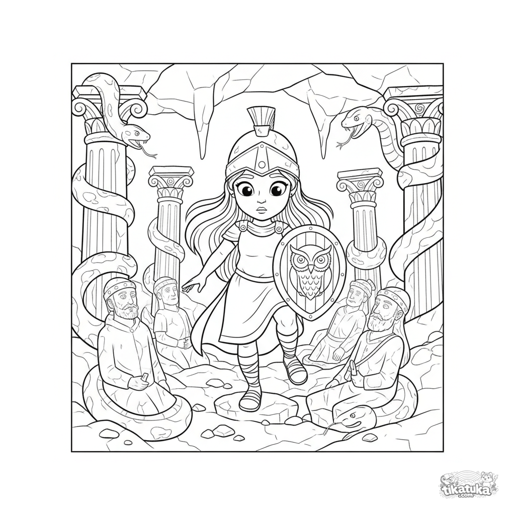 Раскраска для детей 7-9 лет: юная воительница в логове Медузы Горгоны. Сцена с каменными статуями и колоннами, полная таинственной атмосферы древнего мифа.