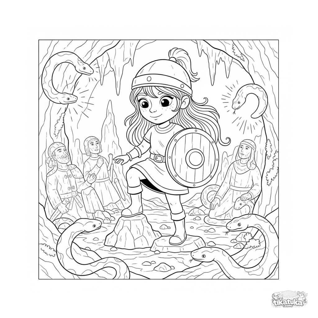 Раскраска для детей 7-9 лет: юная воительница в логове Медузы Горгоны. Сцена с каменными статуями и светящимся мхом, идеальна для развития воображения.