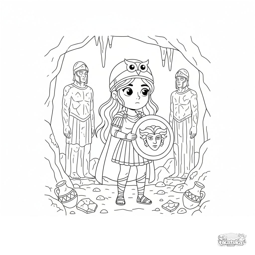 Раскраска: юная воительница в логове Медузы Горгоны. Для детей 7-9 лет. Изображена сцена исследования пещеры с окаменевшими статуями.
