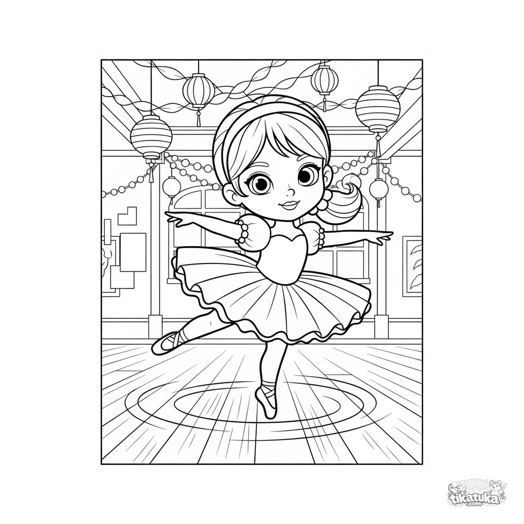 Раскраска для детей 7-9 лет: юная танцовщица в пышной пачке репетирует пируэт в украшенном праздничном зале с гирляндами и фонариками.