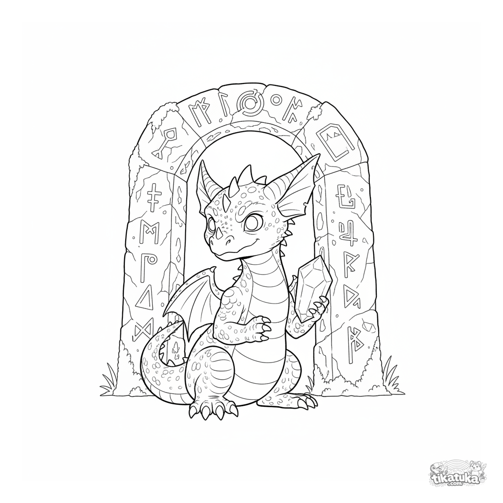 Раскраска для детей 7-9 лет: молодой дракон охраняет таинственный портал из рунических монолитов. Умеренная детализация, выразительная поза, сцена с контекстом для раскрашивания.